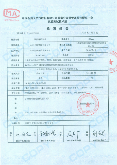 按照SY/T0414-2017要求,聚丙烯防腐膠帶的生產(chǎn)廠(chǎng)家應為使用方,提供由國家認可實(shí)驗室,對其產(chǎn)品依據制造標準,測試檢驗的性能指標完全符合的報告。使用前對聚丙烯防腐膠帶的厚度、基材拉伸強度、對底漆鋼剝離強度、對背材剝離強度、電氣強度、體積電阻率,以及吸水率和水蒸氣透過(guò)率進(jìn)行復檢,測試是否滿(mǎn)足要求,性能指標達不到的杜絕使用。